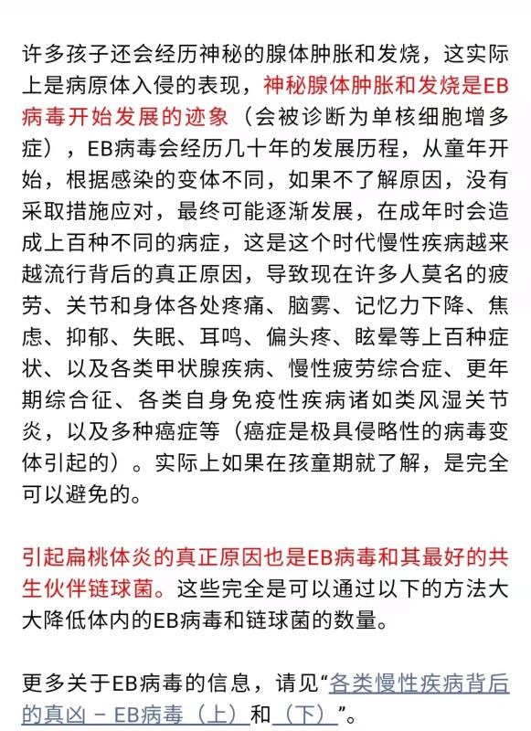 这个我体验太深刻了从小就是一周发烧一次,一月扁桃体肿大一次,后面再大些发作的越发厉害,嘴上人中处经常大水泡,后面发展到嘴唇上水泡一串串,再后面青春期沿脊柱长痘痘,满背的痘,再后面满脸的痘安东尼排毒两年多,扁桃体处一层一层一轮一轮的长痘,消失,再长痘,再消失,没停过,从脓豆到现在细密的脂肪粒样鸡皮感,然后常年肿大的扁桃体现在恢复了正常,不再突出来了,摸着没有下巴那里两个鸡蛋的样子了特别印证这段。医生就是给个标签,扁桃体发炎,然后开青霉素我小时候,12针12针的打。打到我中考后的年纪,有一次直接打休克了,后来就没再用,改吃头孢了。满满血泪史。我除了扁桃体常年肿大两个蛋大硬核,还有腹股沟两个蛋安东尼之后都消肿了,硬核先变大,再变软,再变小,那个疗愈过程,也是满满的煎熬,挺过去就好了。