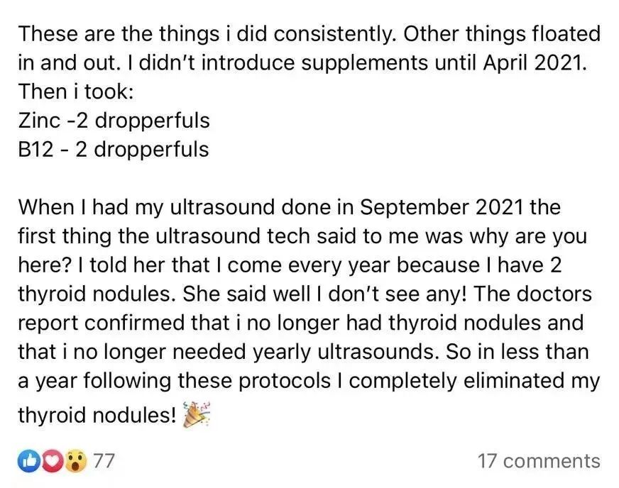 当我在 2021 年 9 月完成超声检查时,超声人员对我说的第一件事就是,你为什么来检查?我告诉她我每年都来,因为我有两个甲状腺结节。她说,好吧,我什么都没看到!医生报告证实我不再有甲状腺结节,而且我不再需要每年进行超声波检查。所以在遵循安东尼威廉方法不到一年的时间里,我完全消除了我的甲状腺结节!?