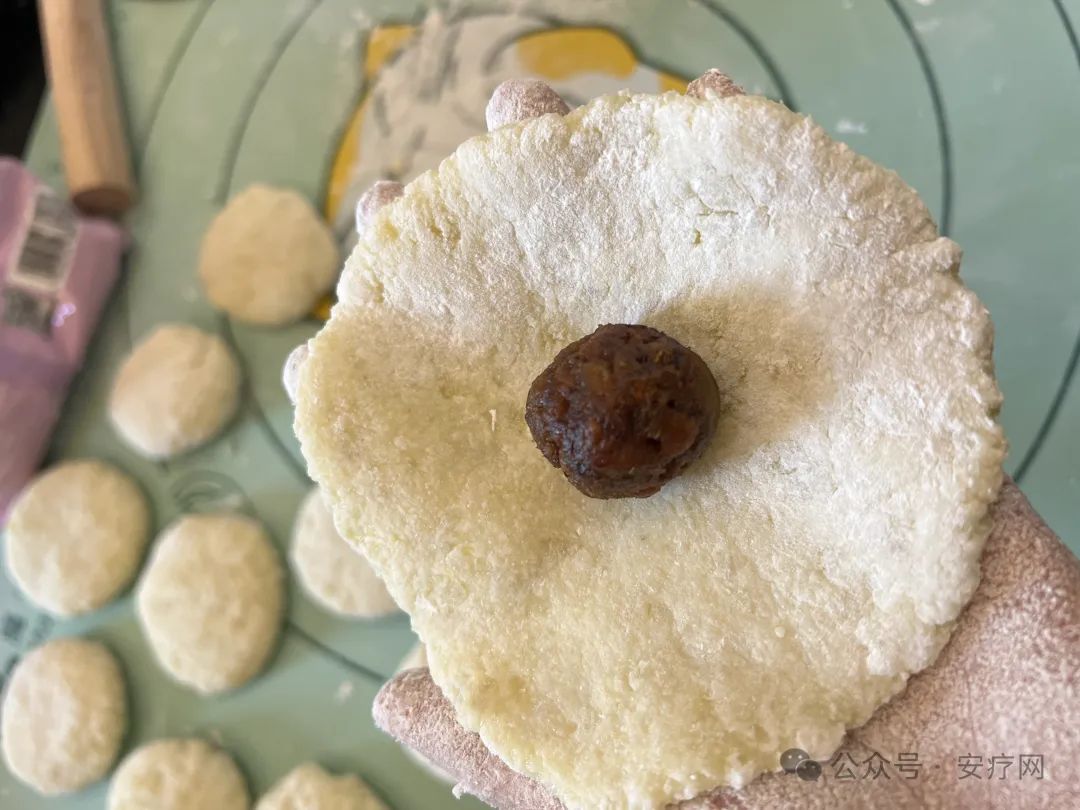 取一块面团,鸡蛋大小,放在掌心揉圆压扁,或者用擀面杖。放入枣泥馅,再包起来搓圆捏紧,如果饼皮多可以去掉一些,再压扁,外面撒一点大米粉