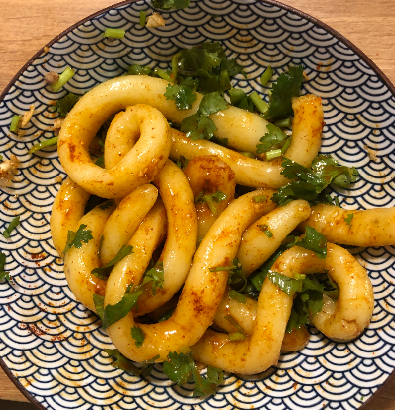 1. 土豆蒸熟压泥,加木薯淀粉,开水烫面揉团