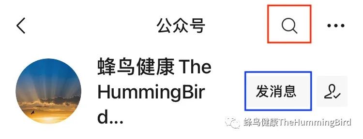 1. 在公众号首页的上方点击下图红色框中的放大镜按钮后输入关键字查询。