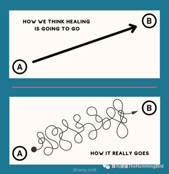 疗愈是一个起伏进步的过程,许多时候,我们很容易忽略疗愈之道上的进步,因为当某些症状消失或者改善,不再造成不适时,我们很容易忘记这些改善,因为不再有病症困扰我们了;我们注意力很容易被依然存在的病症所吸引,让人造成一种错觉似乎没有改善或者进步很慢。这一切只是因为我们很少注意不再困扰我们的事物。